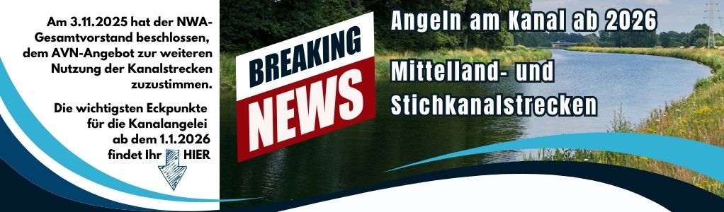 - Da die organisatorischen und schriftlichen Obliegenheiten in den nächsten Wochen noch zwischen AVN und NWA ausgearbeitet werden müssen, können wir derzeit keine detaillierten Fragen rund um die Kanalangelei verbindlich beantworten. Aktuell werden die Regularien des Pachtvertrages / des Verpächters in die Fischereierlaubnis 2026 übernommen. Danach folgt die Abstimmung mit uns, anschließend werden Euch der AVN und die NWA über die weiteren Details zur Angelei am Kanal informieren.