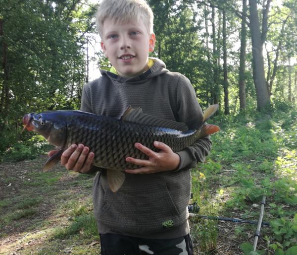 | Datum: 29.05.2022 Angler: Pepe Banas Gewässer: Buschmannsee ohne Insel Fisch: Karpfen Gewicht: 7.500 g Länge: 70 cm Köder: Mais Vermerk: Der erste große Karpfen des kleinen Anglers.